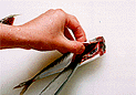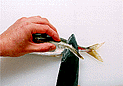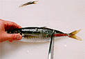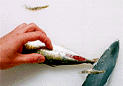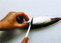 5.Next, scrape off the fine scales covering the body. Hold the head with your left hand and carefully scrape off the scales with a knife, working from tail to head.