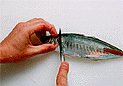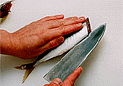 2.First, remove the hard fin near the tail with a quick upward cut from the tail side toward the head.