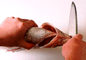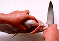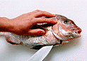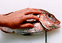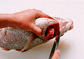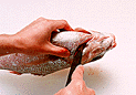 scaling, the gills must be removed. Hold the fish ventral-side-up