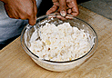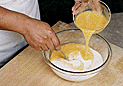 ボールにふるい入れた強力粉に塩少量を加え、フォークでかき混ぜながら溶きほぐした卵を加える。