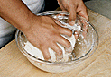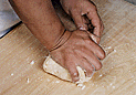 生地を麺台に取り出し、表面がある程度なめらかになるまで、体重をかけながら力強く練る。