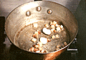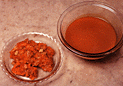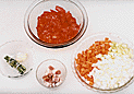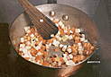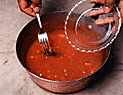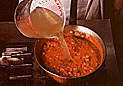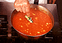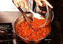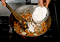| 4. 小麦粉を加え、粉っぽくならないように、焦がさないようによく炒める。 | 5.トマトピューレを加え、しばらく煮て酸味をとばし、トマトを加えてさらに炒める。 | |