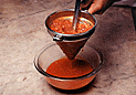 | 7-1.あくをとり、中火にして約40分間煮込み、ブーケ・ガルニを取り出して漉し器で漉す。 | 出来上がりと漉したあと |