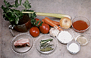 | 1. トマトは、ヘタを取って横半分に切り、種を取り除き、粗く刻む。ベーコン、玉ねぎ、にんじん、セロリは、1cm角に切り、にんにくは縦半分に切って芽を取り除き、軽くつぶす。 | 2.鍋に少量のサラダ油を熱し、ベーコンから脂を引き出すように炒め、にんにくを加える。 | 3.2を中火にして玉ねぎ、にんじん、セロリを加え、しんなりするまで炒める。 |