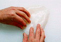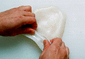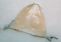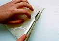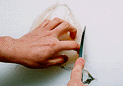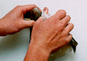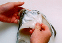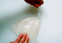 胴の先の部分の皮と身の間に指先をさしこみます。