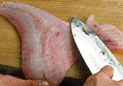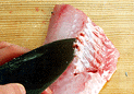 腹骨に沿って包丁をいれすきとります。腹骨はなるべく薄くすきとる方がよろしいでしょう。