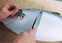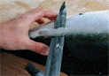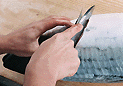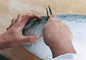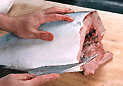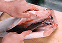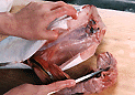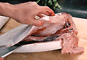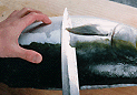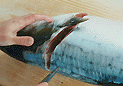 内臓を取り除いたら黒い筋のように見える血合い袋に切り込みをいれます。この段階で流しのところできれいに腹の中及び表面を洗います。ここまでの操作を「水洗い」といいます。