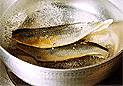 6. 鍋に新しい米のとぎ汁をいれて、その中にきれいに掃除をしたにしんを入れて火
