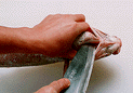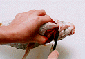 | 7.鱗が取れましたら次にえらをとります。頭部を右側に向け腹部を上にします。 | 8.口の中に包丁の刃元の部分をさし込みます。 | 9.そのまま、押し下げます。そうするとえら蓋が開きますので左手の人差し指をさし込みます。 |