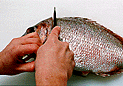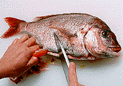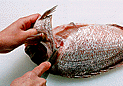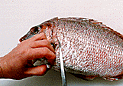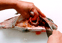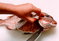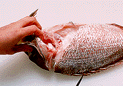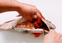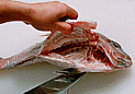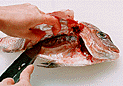 |  |  | | 16.腹部を開けます。 | 17.えらの上顎の付け根に包丁の先をあてます。 | 18.付け根を切ります。 |  |  |  | | 19.えらと内臓を同時に引っ張り出します。 | 20.えらと内臓を取り出した状態です。 | 21.腹部を開け血合い袋のところに包丁をいれます。 この段階できれいに洗います。体全体は勿論、腹部の中までとにかく血液が残ってないようにします。 |  |  |  | | 22.腹部の中をきれいに洗った状態です。 | 23.頭部を落とします。頭部を左側にして腹部を向こう側にしカマの部分を頭部につけるように包丁を手前に引いてきます。 | 24.関節の部分をはずします。 |  |  |  | | 25.次に腹部を手前にして左手でカマの部分をもち手前に包丁をあてます。 | 26.包丁をむこうがわにつき頭部を切り離します。 | 27.頭部と胴体が切り離れた状態です。 |
