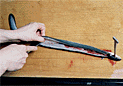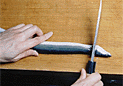 | 7.頭を切り落とす。汚れをこそげて、尾を落とす。 | 8.ひれを引く。尾先に庖丁を入れ、左手でひれを引っ張るように持ち、庖丁を進める。 | 9.開いた身を元に戻し、しりびれを引く。切り分ける。 |