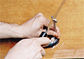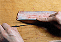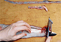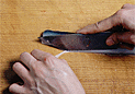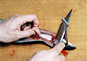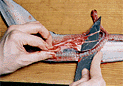 | 4.腹の皮一枚を残すようにぎりぎりの状態で一気に裂く。 | 5.内臓をはずす。尾のほうに向かって引っ張るようにして手でつかみ出す。 | 6.中骨を取り除く。1の切り込みから中骨の下に庖丁の刃先を入れ、身を削り取らないように庖丁を寝かせぎみにして切り進む。 |