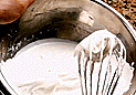 氷水を入れたボールをあてる。泡立て器は左右に揺するようにして泡立てる。このとき、ボールと泡立て器を激しくぶつけすぎると灰色がかったクリームになってしまう。