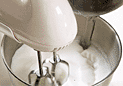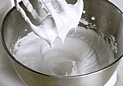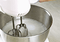 .煮詰まったシロップをメレンゲの中にボールの縁から少しずつ流し入れる。