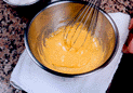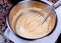 このくらいまで混ぜると後の材料が混ぜやすく、卵に直接牛乳の熱が伝わりにくくてよい。