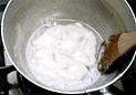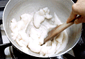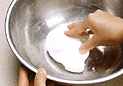 .木杓子で生地を持ち上げ、親指のつけ根あたりで素早くさわって生地がくっいてこなけば練り上がり。