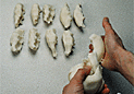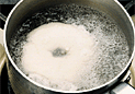 | 8. 手で平たく伸ばし、中心に穴をあけて入れる。 |