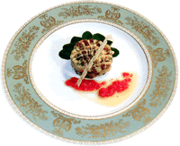 新鮮なマグロとホタテ貝柱を小さいさいの目に切り、同様に刻んだ キュウリ・赤ピーマン・セロリ、オリーブ油 、レモン汁、マヨネーなどとあわせたタルタル。表面にトマトのピュレを乗せ、マヨネーズにアンチョビペーストを混ぜたものを絞り出してある