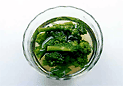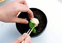 椀盛りします。器に温めた海老真丈、菜種、椎茸、木の芽を盛ります。