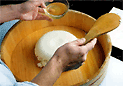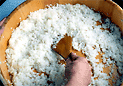 炊き上げた御飯は、半切りに移します。熱い間に寿司酢をかけます。寿司酢の基本分量は、米3合に対し酢100cc、砂糖大さじ5、塩小さじ3です。