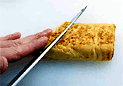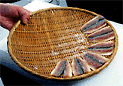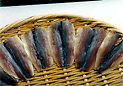 だしまき卵です。分量は卵8個、だし汁70cc、砂糖100g、みりん15cc、薄口醤油30cc、塩少量です。この分量で生地を作り、適当な太さに巻きます。