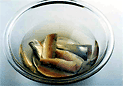 蛤を一晩漬け地に漬け込みます。漬け地は、水270cc、砂糖100g、濃口醤油900cc、塩少量を合わせ、一煮立ちさせ冷ましたものです。