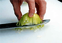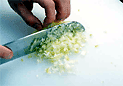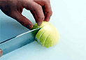 玉 葱をみじん切りします。まず2等分にして右端から5mm間隔で切り込みをいれます。