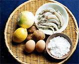 4人分 芝海老……………………500g 玉葱………………………1個 生椎茸……………………4枚 卵の素…………………大さじ2 レモン ……………………1個 片栗粉……………………2カップ うまみ塩 …………………適量