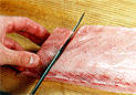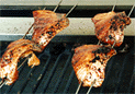 | 4.塩を洗い落とし水気を拭き取り、金串をうちます。 | 5.少し身を曲げるようにして打つと盛り付けしたときに立体感がでます。 | 6.火にかざします。 |