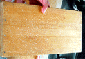 | 1.鰤は、厚い目にそぎ切りにします。1切れあたり80g程度にします。 | 2.抜き板に振り塩をします。 | 3.切り身を並べ、更に上から塩をします。このまま30分ほどおきます。塩をすることにより臭みを和らげます。 |