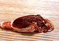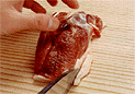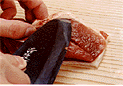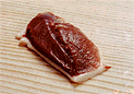 1.鴨の胸肉です。2.回りの余分な脂を取ります。3.赤身の上についている脂も取ります。