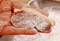 7.切り口に包丁の刃元で切り込みを入れます。8.バットに片栗粉を入れまぶします。9.両面まぶして軽くたたいて馴染ませます。