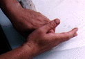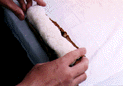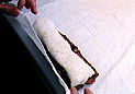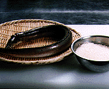 | 4. Place the teriyaki hamo on a muslin cloth. Shape the rice into a long block and place on top of the teriyaki hamo. | 5. Bring up the bottom flap of the muslin and roll the rice block so that the hamo is on top of the rice. | 6. Tighten the cloth to press the rice and hamo into place. |