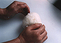 | 1. Prepare the sushi rice. Cook the rinsed rice with the same amount of water. Allow it to settle, and transfer to a large wooden sushi bowl. Pour sushi vinegar over the top, and mix into the rice by cutting across it with a wooden rice spoon in a fast slashing motion. To make sushi vinegar, stir together 100 cc vinegar, 5 tbsp sugar and 3 tsp salt. | 2. Take an appropriate amount of sushi rice and shape it into a ball. | 3. Knead on a chopping board to make the rice slightly sticky. |