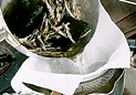 Peel the lotus root and quarter it. Slice each quarter thinly