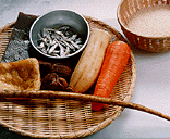 Put washed rice, seasoned stock, prepared vegetables, konnyaku