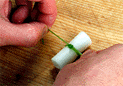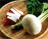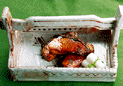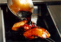 | 10.たれが乾いたら更にたれをかけます。おいしそうな照りをつけましょう。 | 11.蕪の奉書巻きを作ります。 | 12.盛り付けします。仕上げに粉山椒を少量ふります。 |