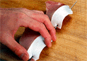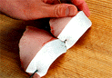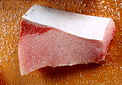 | 1.鰤は、厚い目にそぎ切りにします。1切れあたり80g程度にします。 | 2.抜き板に振り塩をします。 | 3.切り身を並べ、更に上から塩をします。このまま30分ほどおきます。塩をすることにより臭みを和らげます。 |