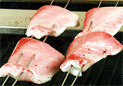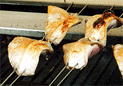 | 4.塩を洗い落とし水気を拭き取り、金串をうちます。 | 5.少し身を曲げるようにして打つと盛り付けしたときに立体感がでます。 | 6.火にかざします。 |