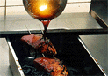 | 7.このくらいの焼き目がつけば返して更にもう片面を焼きます。 | 8.たれをかけます。 たれの分量を鍋に合わせて火にかけ2割ほど煮詰めます。 | 9.更に火にかざします。 |