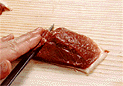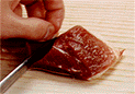 <鴨の仕込みをする><芹の仕込みをする><すだれ麩の仕込みをする><仕上げ>  |  |  | | 1.鴨の胸肉です。 | 2.回りの余分な脂を取ります。 | 3.赤身の上についている脂も取ります。 |  |  |  | | 4.この様な状態になります。 | 5.左端より5mm厚でそぎ切りにします。 | 6.包丁を引いてきて一気に切るようにします。 |  |  |  | | 7.切り口に包丁の刃元で切り込みを入れます。 | 8.バットに片栗粉を入れまぶします。 | 9.両面まぶして軽くたたいて馴染ませます。 | | | |