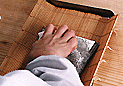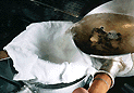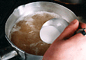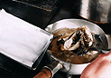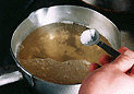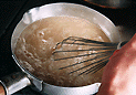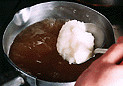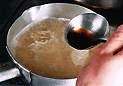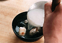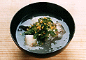 椀におこぜの身、焼き餅を盛り付け吸い地をはります。