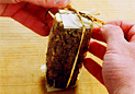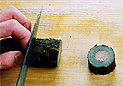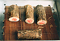 両端の切り口を薄板で抑え、竹の皮の細くさいたものでくくる。 |