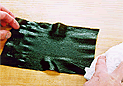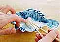 昆布を水1カップ、酢1カップ゚、砂糖90g、塩少量を合わせた甘酢につけて柔らかく戻す。柔らかくなれば両面の水分を軽く拭き取る。