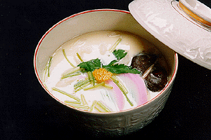 おだまき蒸しというのは、簡単に言えばうどんの入った茶碗蒸しのことです。なぁーんだと思われるかもしれませんが、昔は言わば高級料理の一つだったんです。何故かといいますと、卵は、昔貴重なもので一般庶民の口には中々入るものではありませんでしたから。