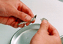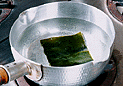 | 1.煮干しで出しを引く。煮干しは頭の部分を取り除く。 | 2.腹の部分をとる。頭と腹の部分を取り除くのは出しに余分な味が出ないためである。又、きれいに澄んだ出しを引くことも出来る。 | 3.水6カップを鍋に入れ5cm各の昆布1枚を加えて火にかける。 |