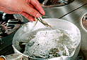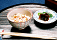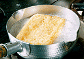 | 7.薄揚げは、熱湯に落として油抜きをする。 | 8.人参…3cm長さでマッチの軸程度の太さに切るこんにゃく…塩もみしてゆがいた後、短冊型に切る 薄揚げ…細かく微塵きりにする牛蒡…笹がき牛蒡にする 生椎茸…軸をとり薄切りする蓮根…皮をむき4つ割りにして薄切りする | 9.煮干しの出しに塩、みりん、薄口醤油で味付けし釜に洗い米、調味した出し汁、具を加えて炊き上げる。 |