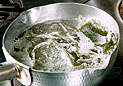 | 4.沸騰してくれば煮干しの胴体の部分のみを加える。 | 5.火を中火程度にし数分煮出す。 | 6.あくをとりペーパータオルで漉す。 |