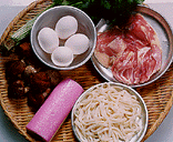 | 4.生椎茸は、軸を取り除ききれいに洗い水気を拭き取る。 | 5.蒲鉾は左端より3mm厚さにそぎきりにする。 | 6.三つ葉は、根を切り落とし1,5cmm長さに切る。 |