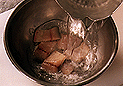 | 1.鯖は、水洗いして三枚卸しにし、腹骨をすきとる。頭は縦半分に切り、えらとひれを切り取る。中骨の部分は適当にきる。それぞれに強い目に塩を振って約1時間おく。 | 2.1の鯖の塩を洗い落として水気をふきとる。身は血合い骨を骨抜きで抜き取り、片身を4等分切る。 | 3.身とあらをそれぞれ別のボールに入れて熱湯を注ぎ、静かにかき混ぜる。表面の色が白く変われば水に落として水気を切る。 |